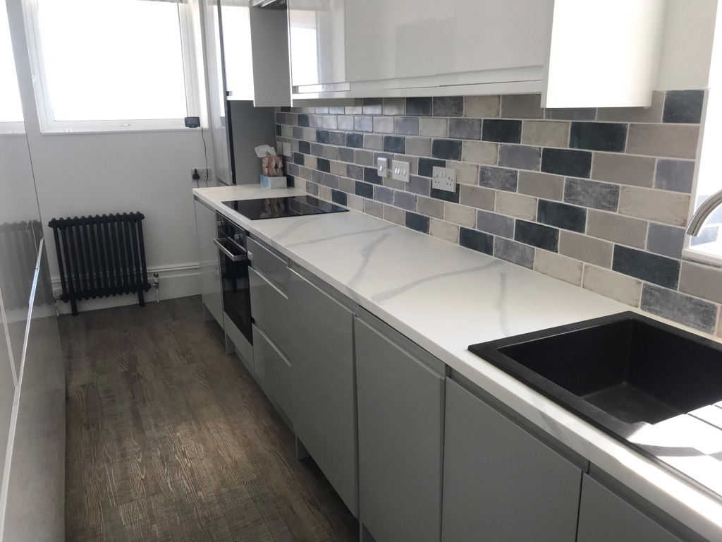 Fitted with a range of white lacquered fronted floor and wall cupboards with marble effect work surfaces. Inset sink. Built-in stainless-steel oven, inset electric induction hob with extractor canopy/light over. Integrated fridge, dishwasher and washing machine. Cupboard housing ‘Valliant’ gas fired boiler. Column radiator, double aspect with Channel view to the front.