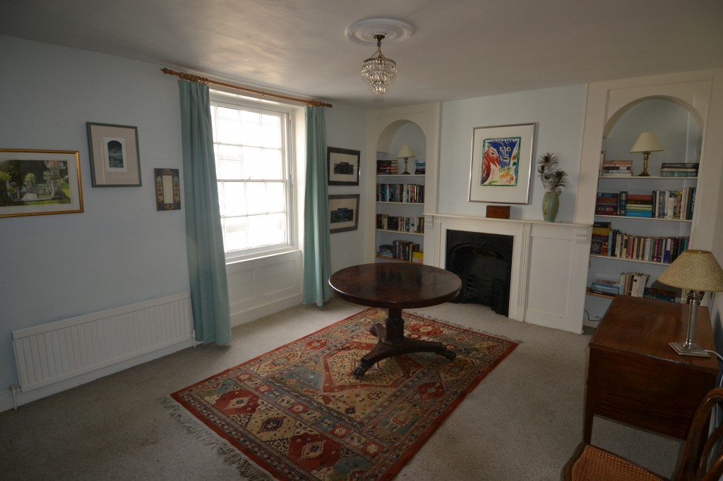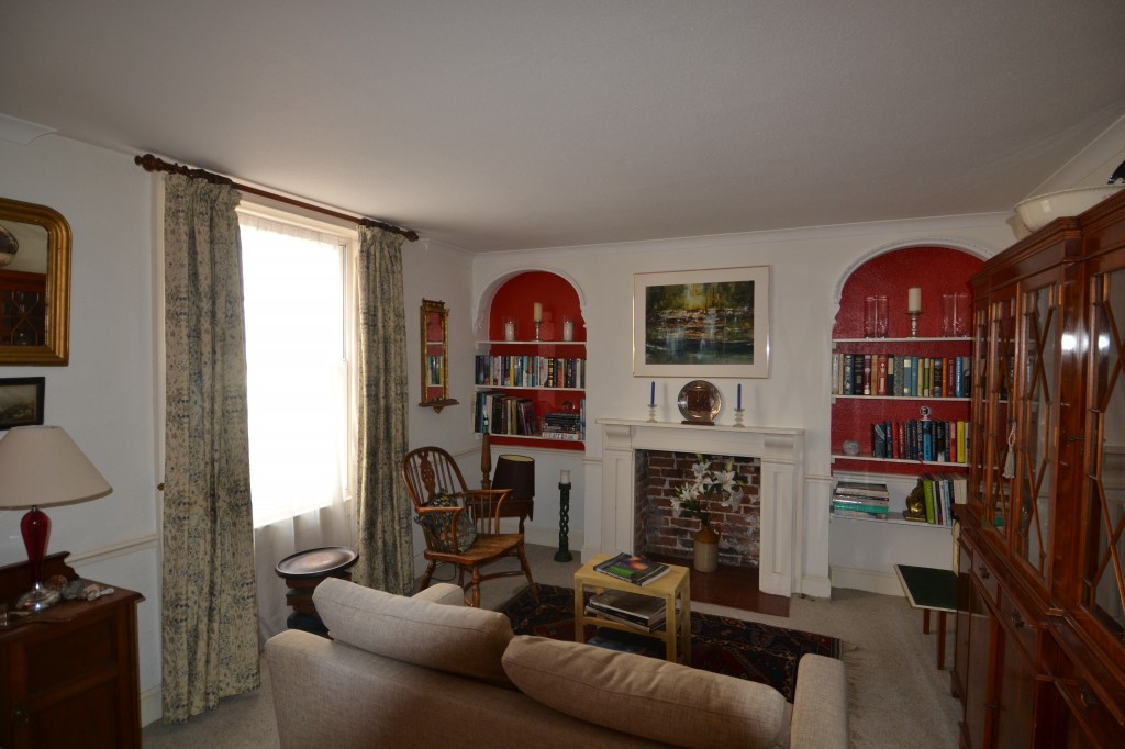 Period fireplace, bookshelves to recesses flanking fireplace, double radiator, door to: