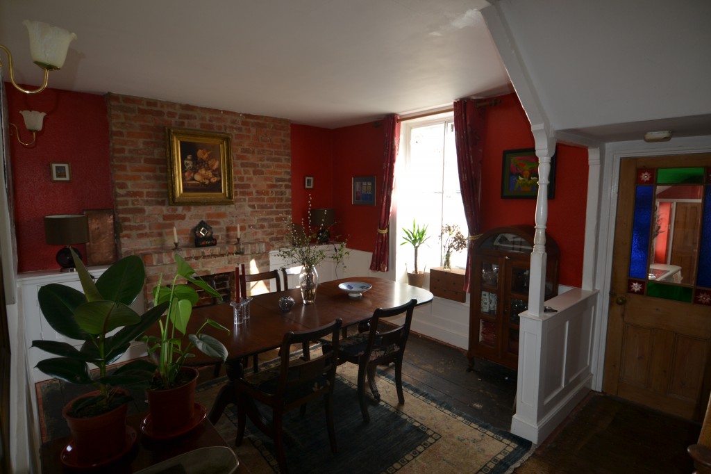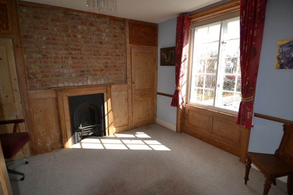 View over rear garden, window seat, exposed brick chimney breast, built in cupboards, painted panelling to dado height, double radiator. Pine door with decorative glazed panels to:
