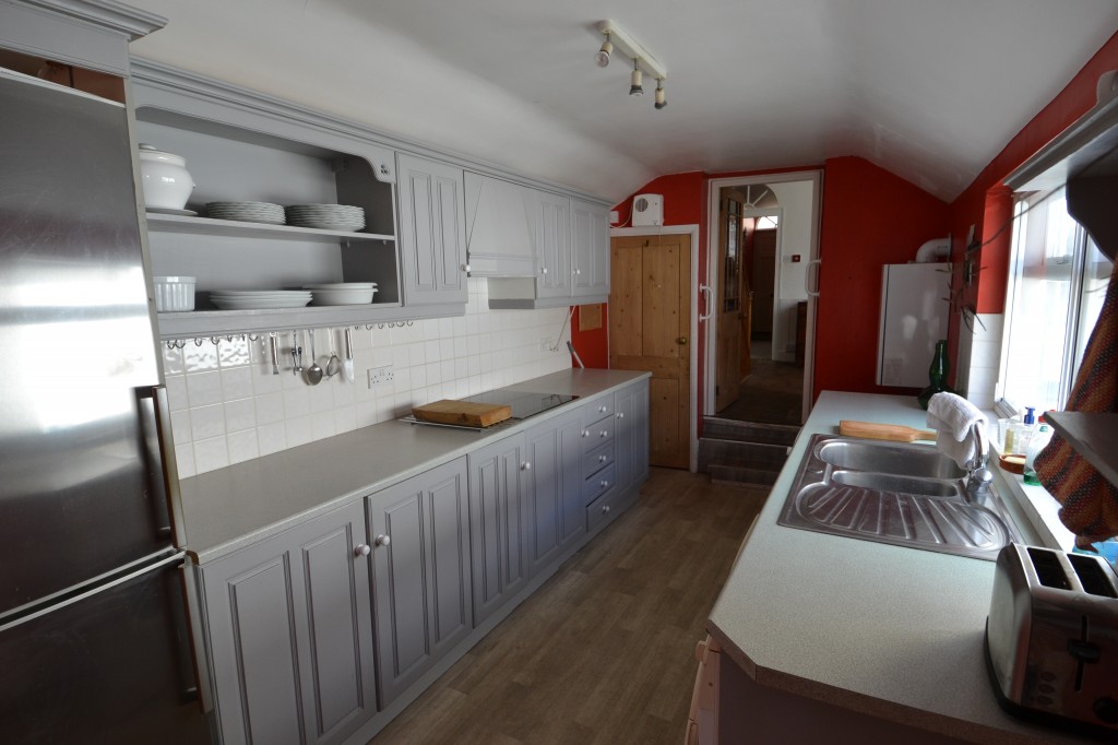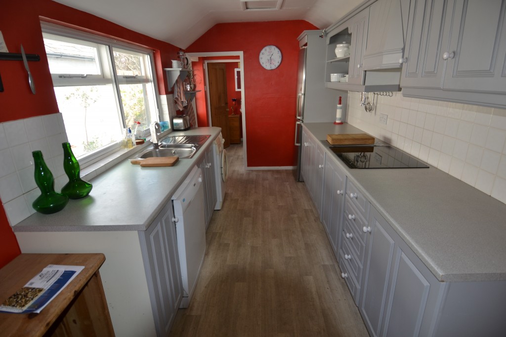 Fitted with a range of grey painted floor and wall cupboards with granite effect worksurfaces, inset 1½ bowl stainless steel sink, space and plumbing for cooker, space for fridge/freezer, radiator, wall mounted gas fired boiler.