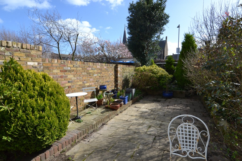 Sunny south facing rear garden (approx. 70’ depth). Courtyard style with old flagstone and concrete paving, raised planters stocked with a variety of established plants and shrubs, holly tree, gravel area. Tool shed.