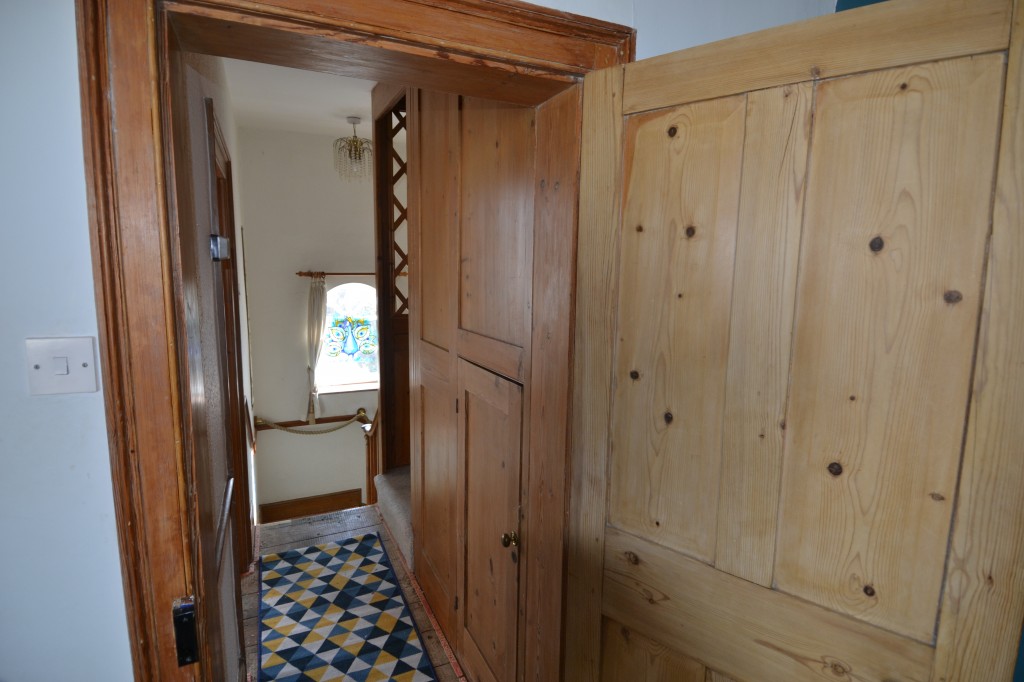 View over rear gardens, cast iron fireplace with stripped pine surround, built in cupboards, double radiator.