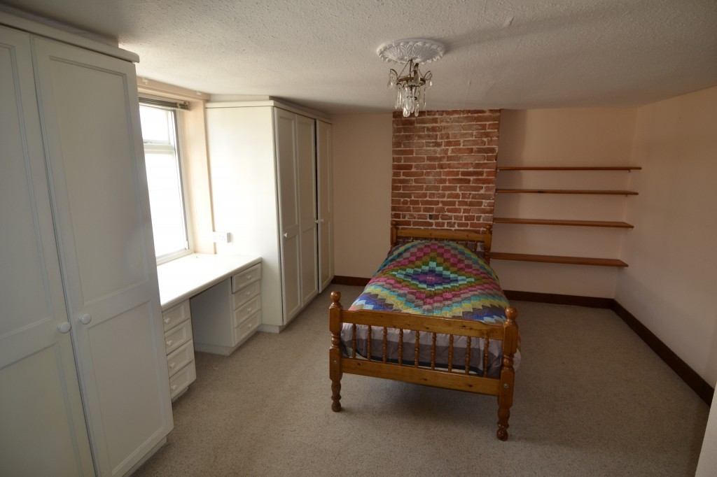 Exposed brick chimney breast, built in wardrobes and dressing table with drawers, radiators. Access hatch to roof space.