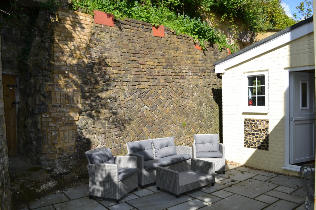 Old flint wall and picket fence to front. Gate to sheltered and enclosed paved courtyard garden. Small cave like store built into cliff face.