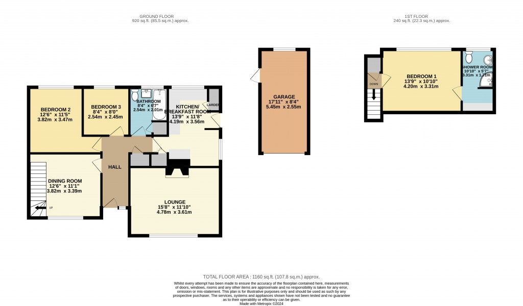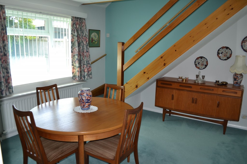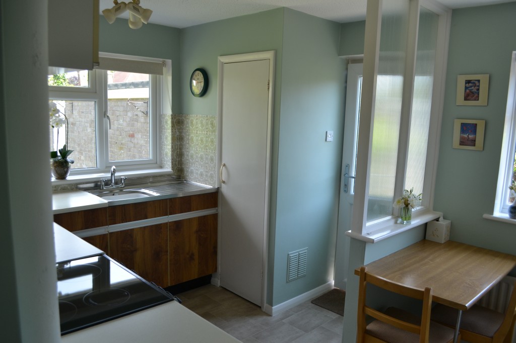 Fitted with a range of timber effect floor and wall cupboard with pale granite effect work surfaces. Stainless steel sink, ‘Belling’ electric cooker, space for fridge/freezer, space and plumbing for washing machine, space and vent for tumble dryer, radiator, larder cupboard, broom cupboard, ½ glazed uPVC door to garden. ‘Ideal Mexico’ gas fired boiler for central heating and hot water. Window overlooking rear garden and another to the side.