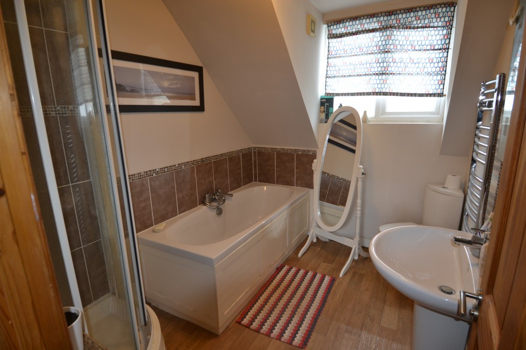 Panelled bath with spray mixer. Hand basin, WC. Corner shower cubicle with sliding doors, chrome ladder style radiator.