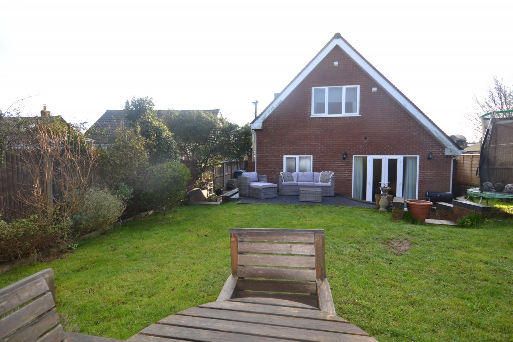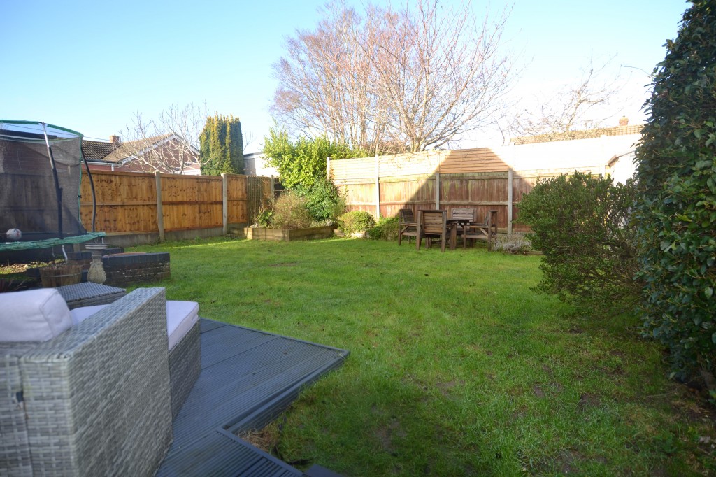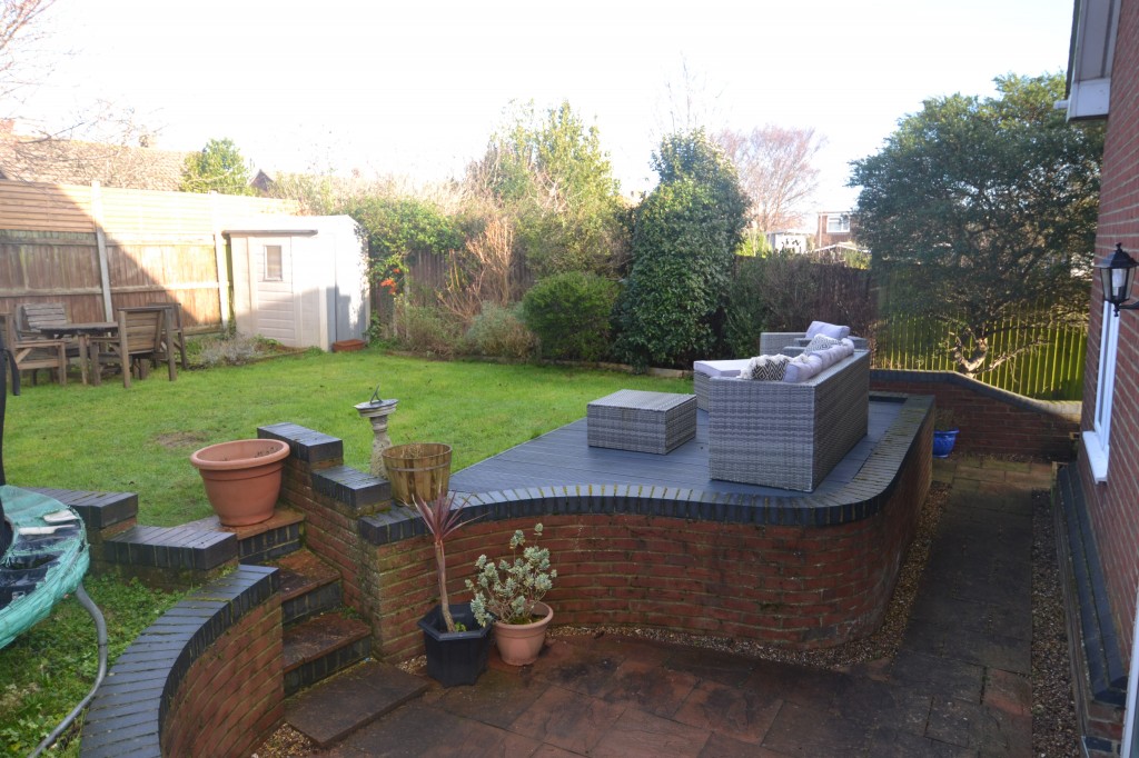 Block paved driveway/parking area for 3 cars. Shrub border. Side gate with path leading to rear garden, semi circular paved seating area with steps up to level lawn with plant shrub border, timber decking. Tool shed and side lean tool store.