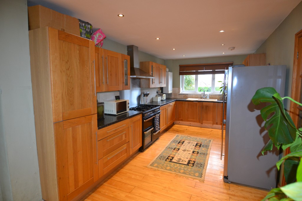 KITCHEN AREA with a range of oak fronted floor and wall cupboards with granite effect work surfaces. Inset 1 ½ bowl ceramic sink. Integrated dishwasher, space and plumbing for washing machine, space and gas point for double width range style cooker with stainless steel extractor canopy/light over. Space for American style fridge freezer. Inset downlights. Wall mounted gas fired boiler.