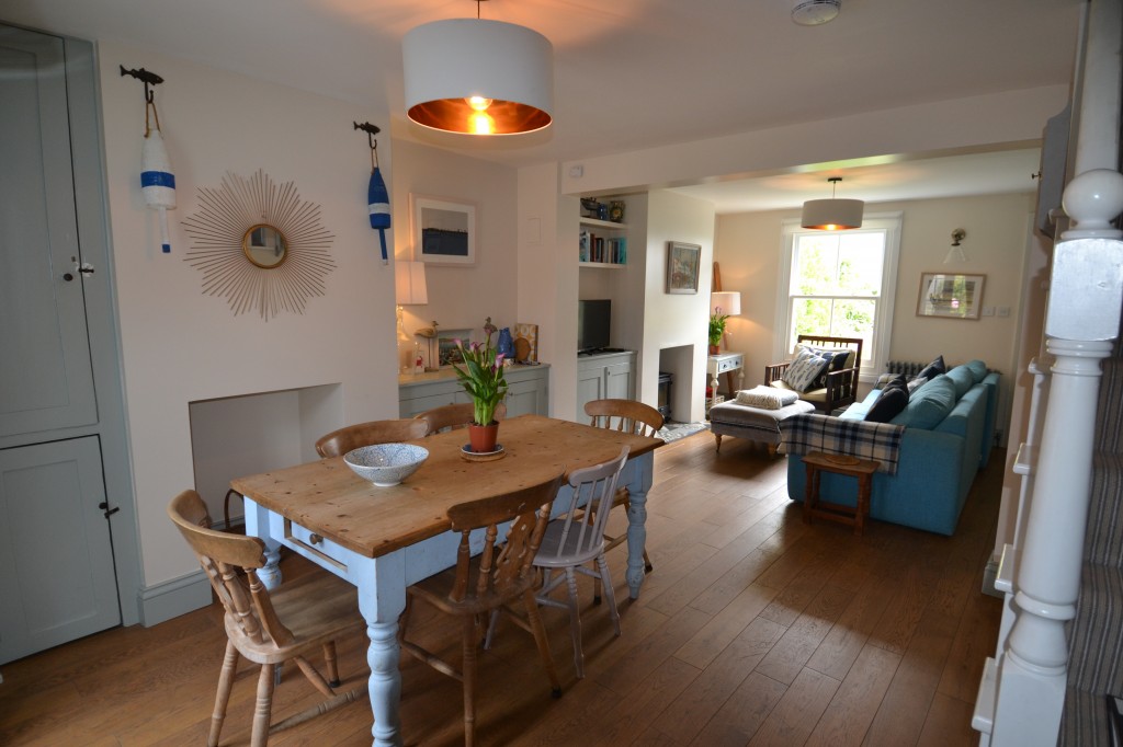 Double aspect with glazed double doors to rear garden and window overlooking front garden. Wood burning stove, built in cupboards. Oak flooring, 2 cast iron radiators, 3 wall light points, staircase to 1st floor and double doors to;