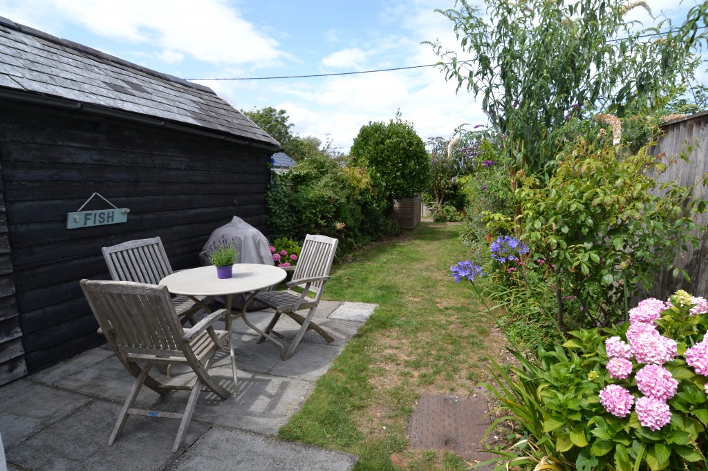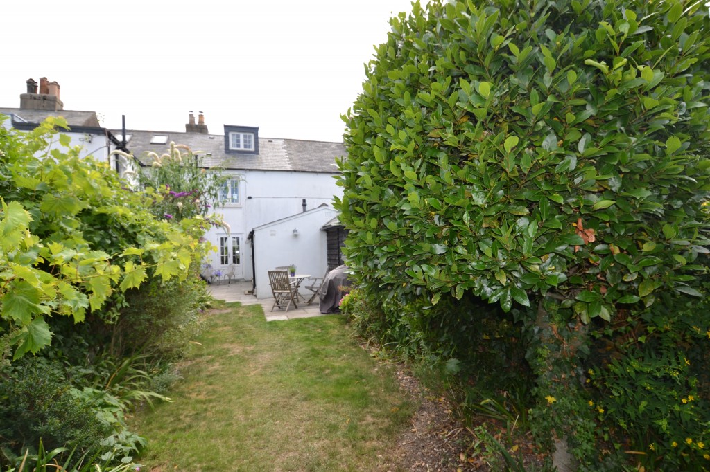 Rear garden paved courtyard area. Kitchen leading to lawn with further paved area, borders stocked with established plants and shrubs, timber shed. Gate to Shrimp Lane.