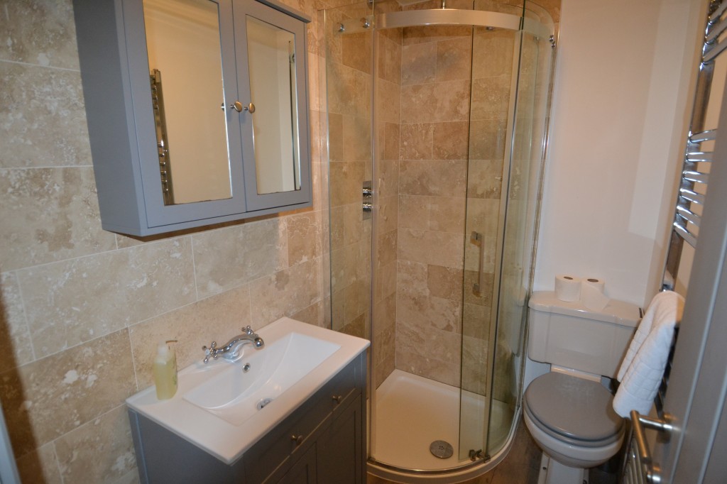 Panelled bath with wall mounted shower over, WC, hand basin with cupboard under. Cupboard housing wall mounted ‘Worcester’ gas fired boiler, ladder style towel rail, tiled floor.