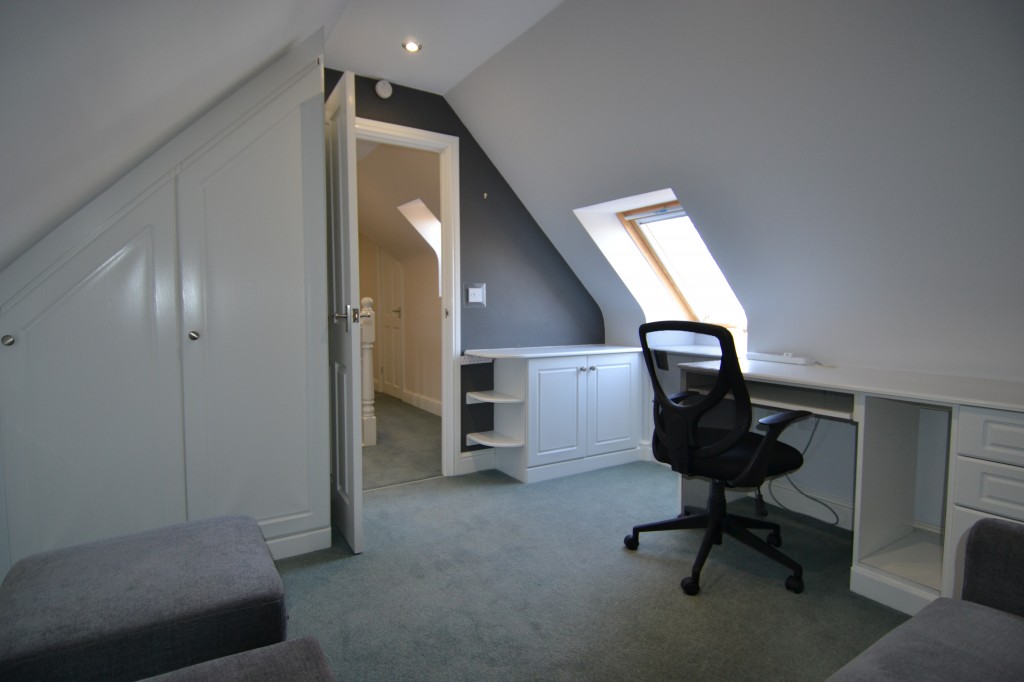 Built in wardrobes, dressing table/desk, drawer unit and cupboards, double radiator, inset downlights and Velux window.