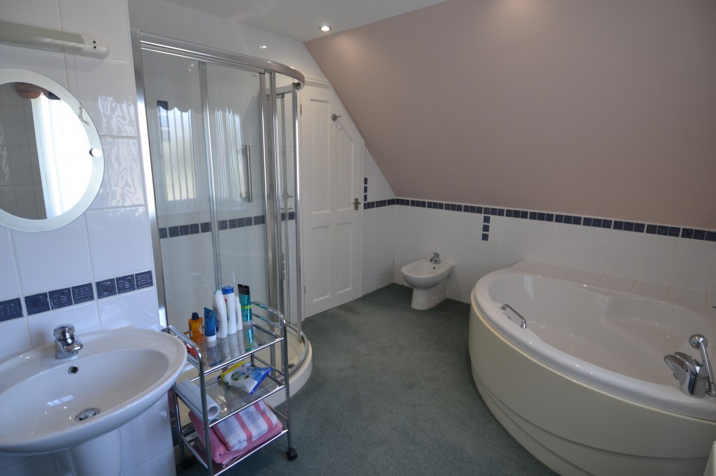 Corner bath, WC with concealed cistern, bidet, hand basin, corner shower cubicle with sliding glass doors, radiator, chrome ladder style radiator/towel rail, fully tiled walls, Inset downlights.