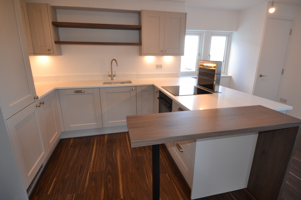 LIVING ROOM -Two radiators, cupboard housing ‘Worcester’ gas fired boiler. KITCHEN fitted with a range of ‘shaker’ style painted floor and wall cupboards with marble worksurfaces. Inset Neff induction hob with pop up extractor/light. Inset 1 ½ bowl sink, integrated dishwasher and fridge/freezer, built in oven.