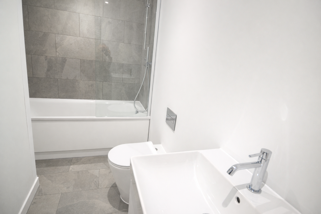 Panelled bath with wall mounted shower over, glass shower screen, hand basin with drawer under. WC with concealed cistern, chrome ladder style towel rail/radiator, inset downlights, underfloor heating.