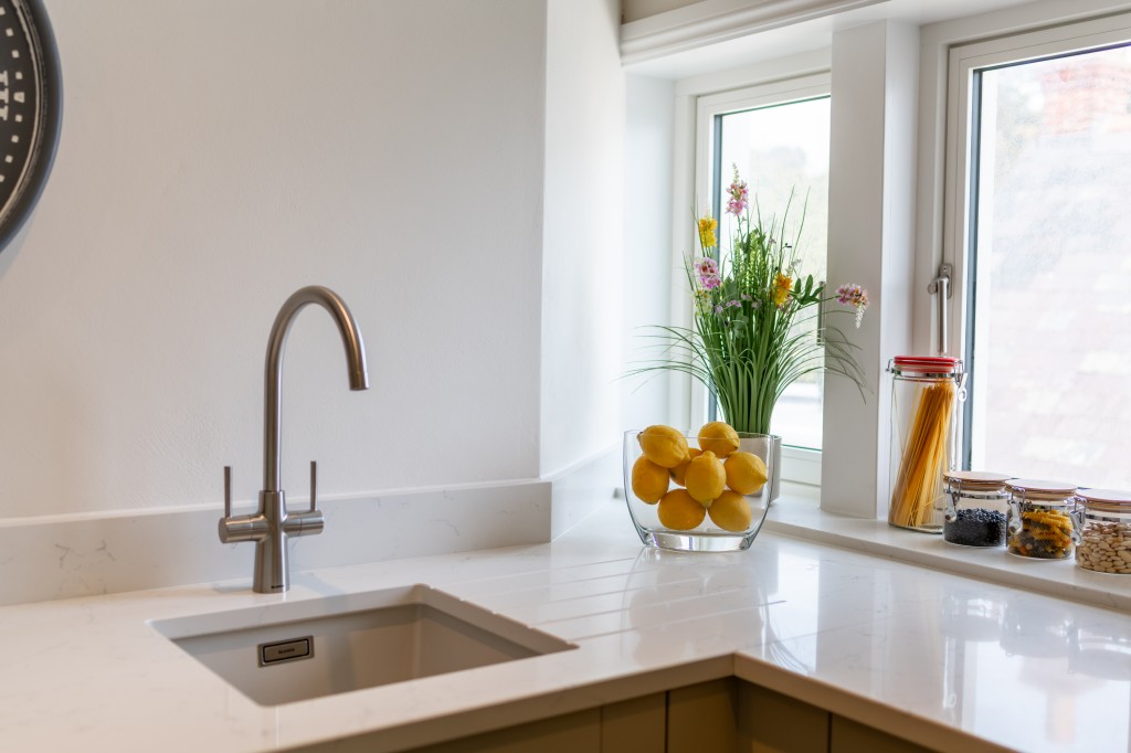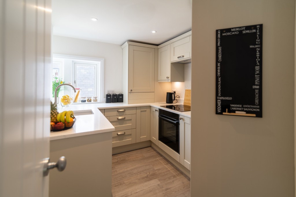 Fitted with a range of Shaker style floor and wall cupboards with quartz worktops with inset sink. Built in Neff appliances, oven, induction hob with extractor canopy/light, fridge/freezer and dishwasher. Cupboard housing ‘Worcester’ gas fired boiler, column style radiator.